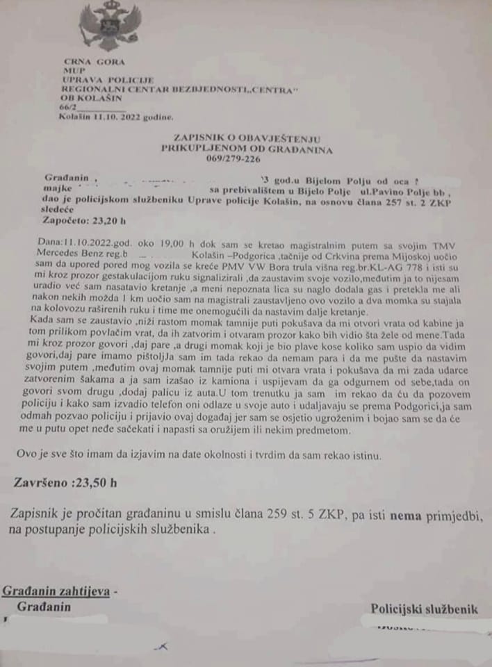 M. K. iz Bijelog Polja, juče je na crnogorskoj cesti doživio pokušaj razbojništva.